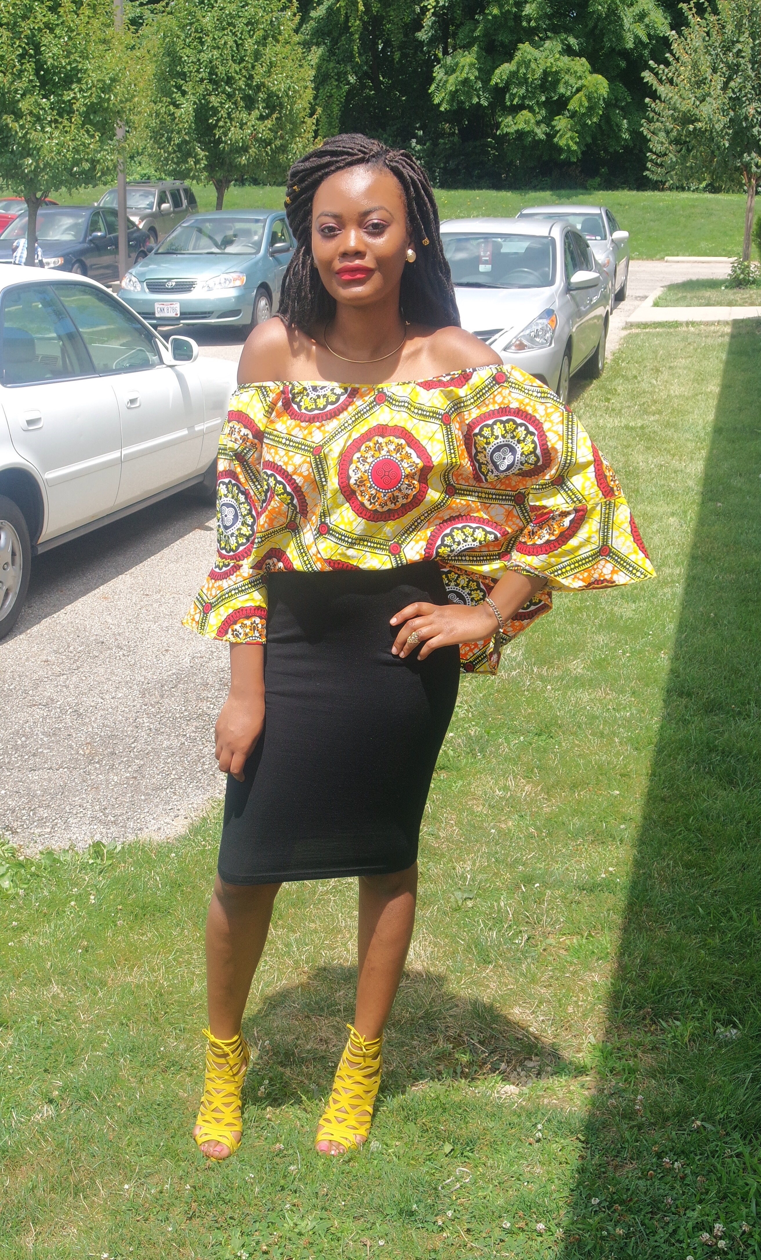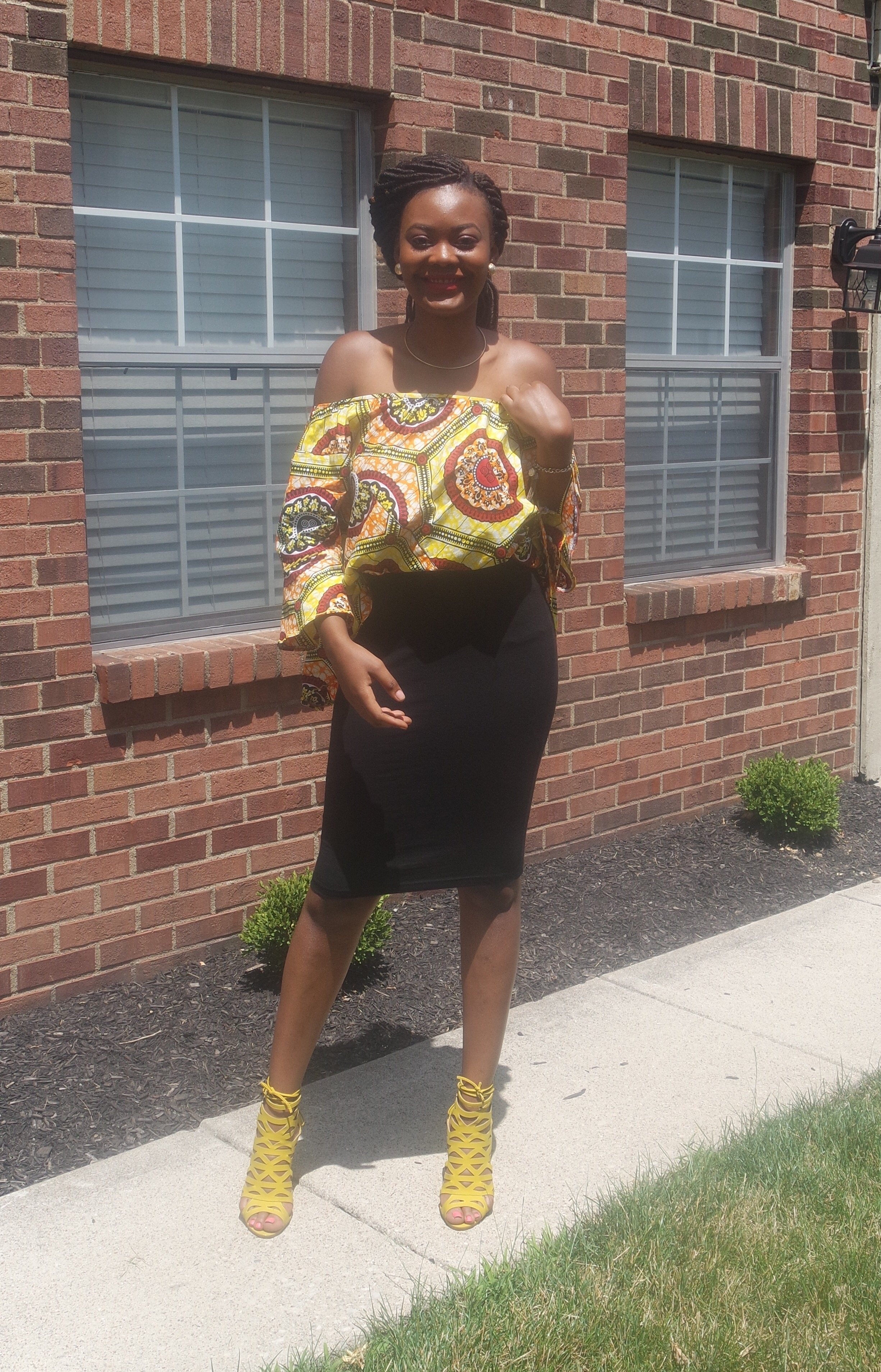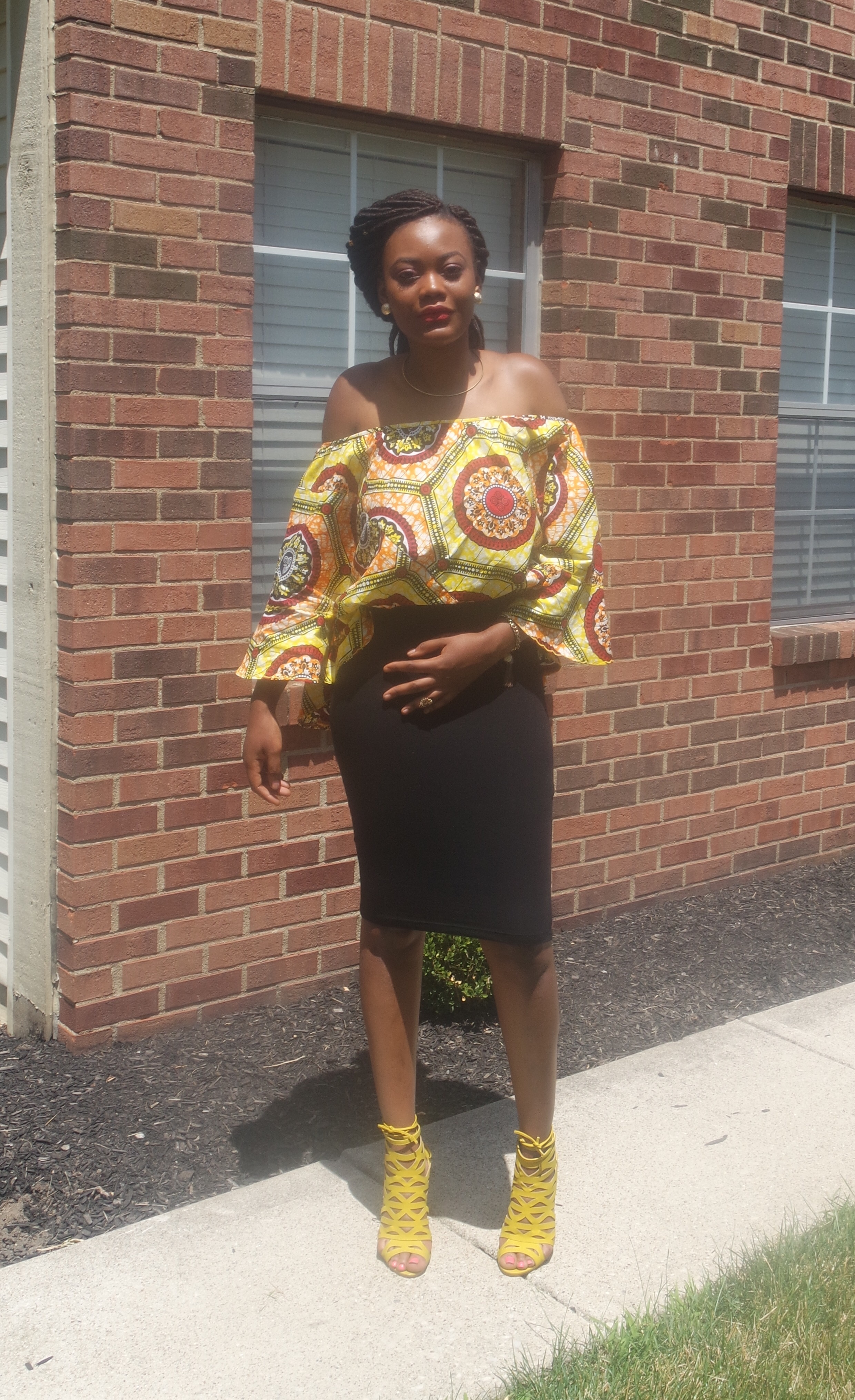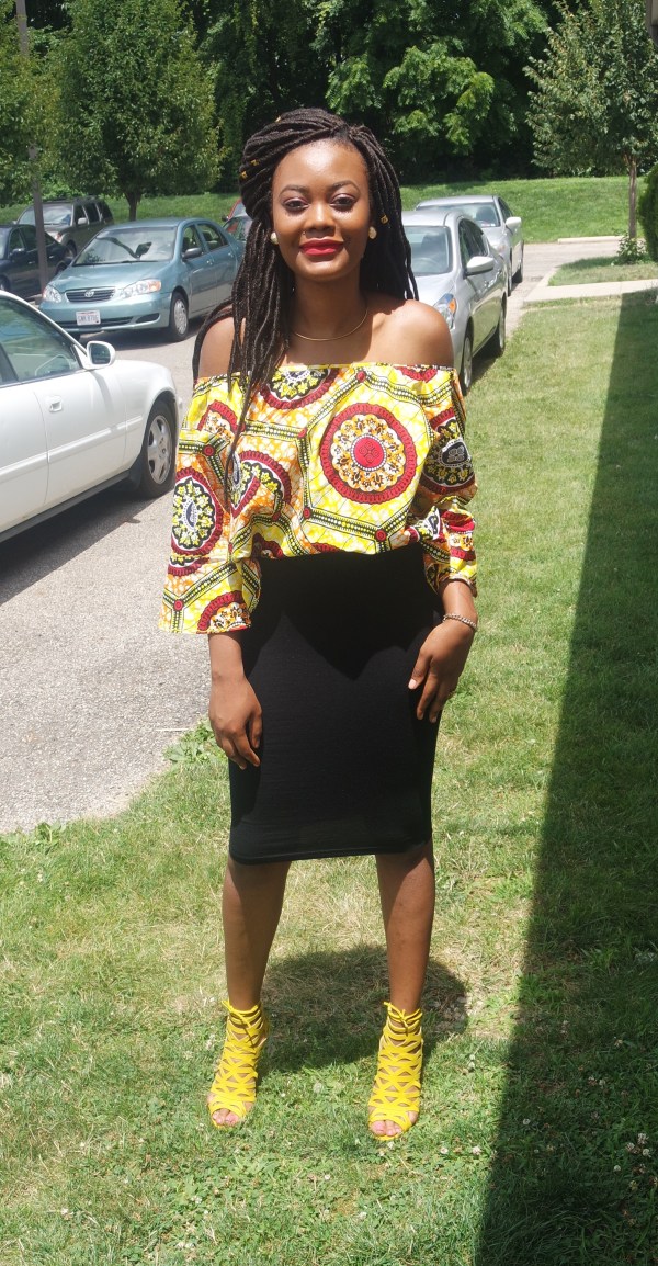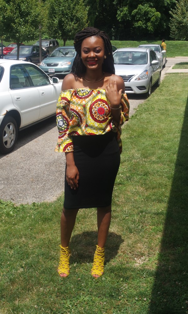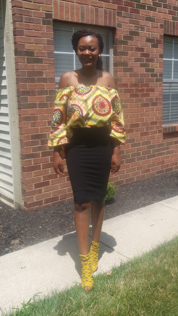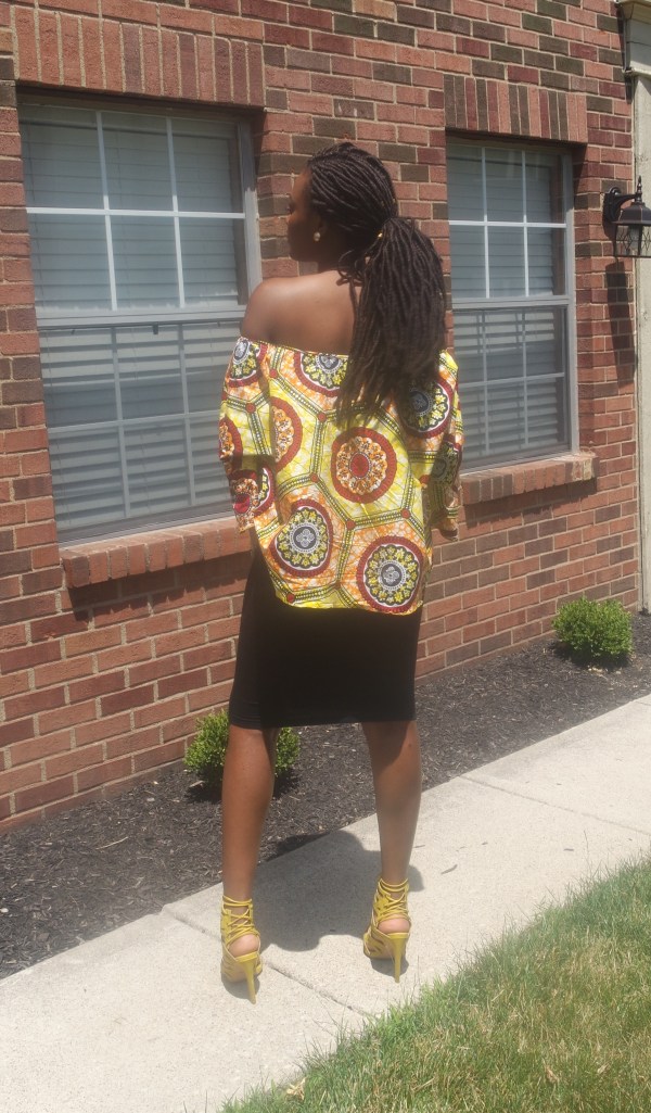 I definitely had to rep my people in an African print top. This top has been a trendy Ankara style I’ve seen everywhere by my church. I wanted to were y with a white skirt but for whatever reason that’s a scarce product to find. I gave in and wore my black body con skirt and I must say it gave the same affect I wanted. I changed it up a little and tugged in the front a bit.