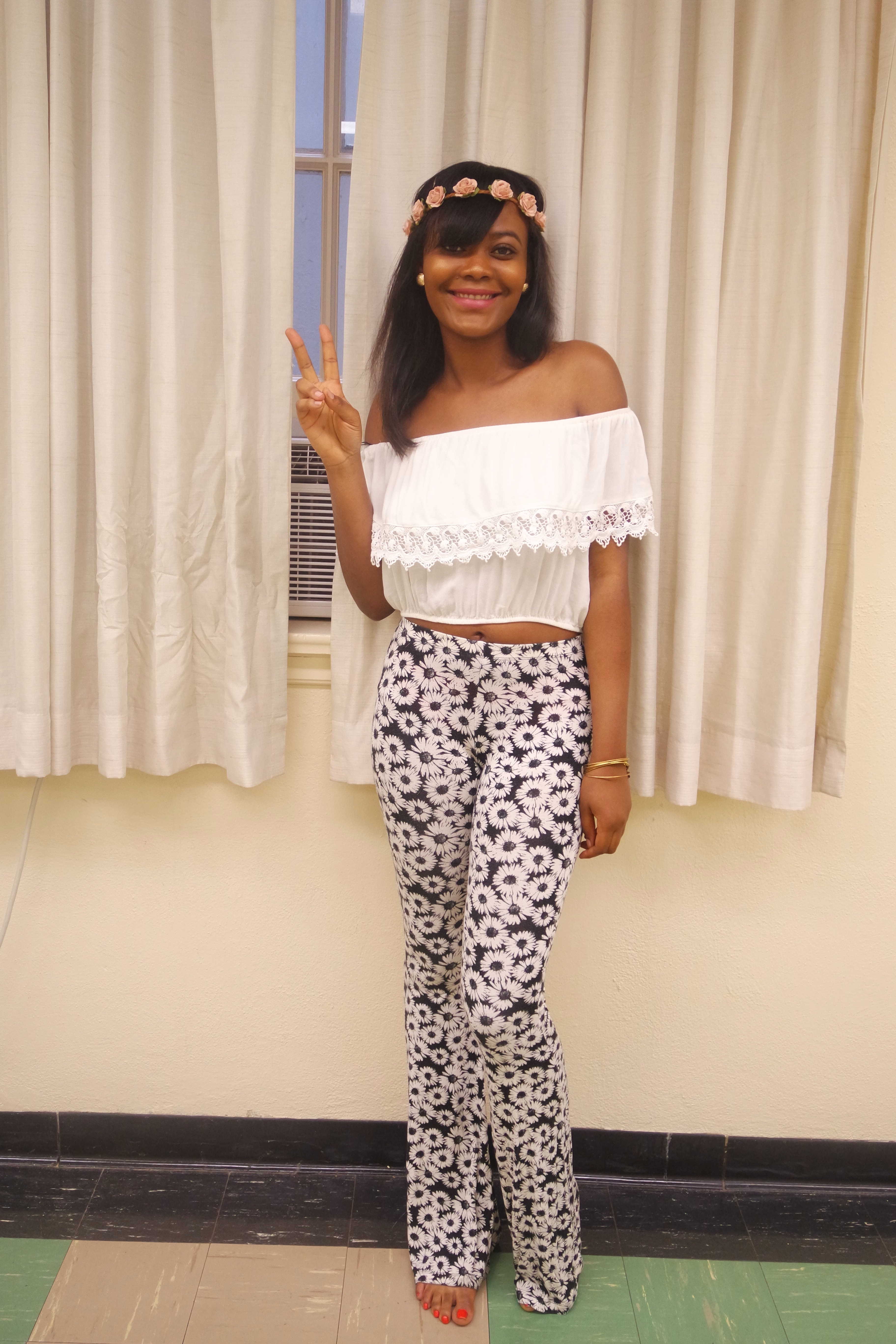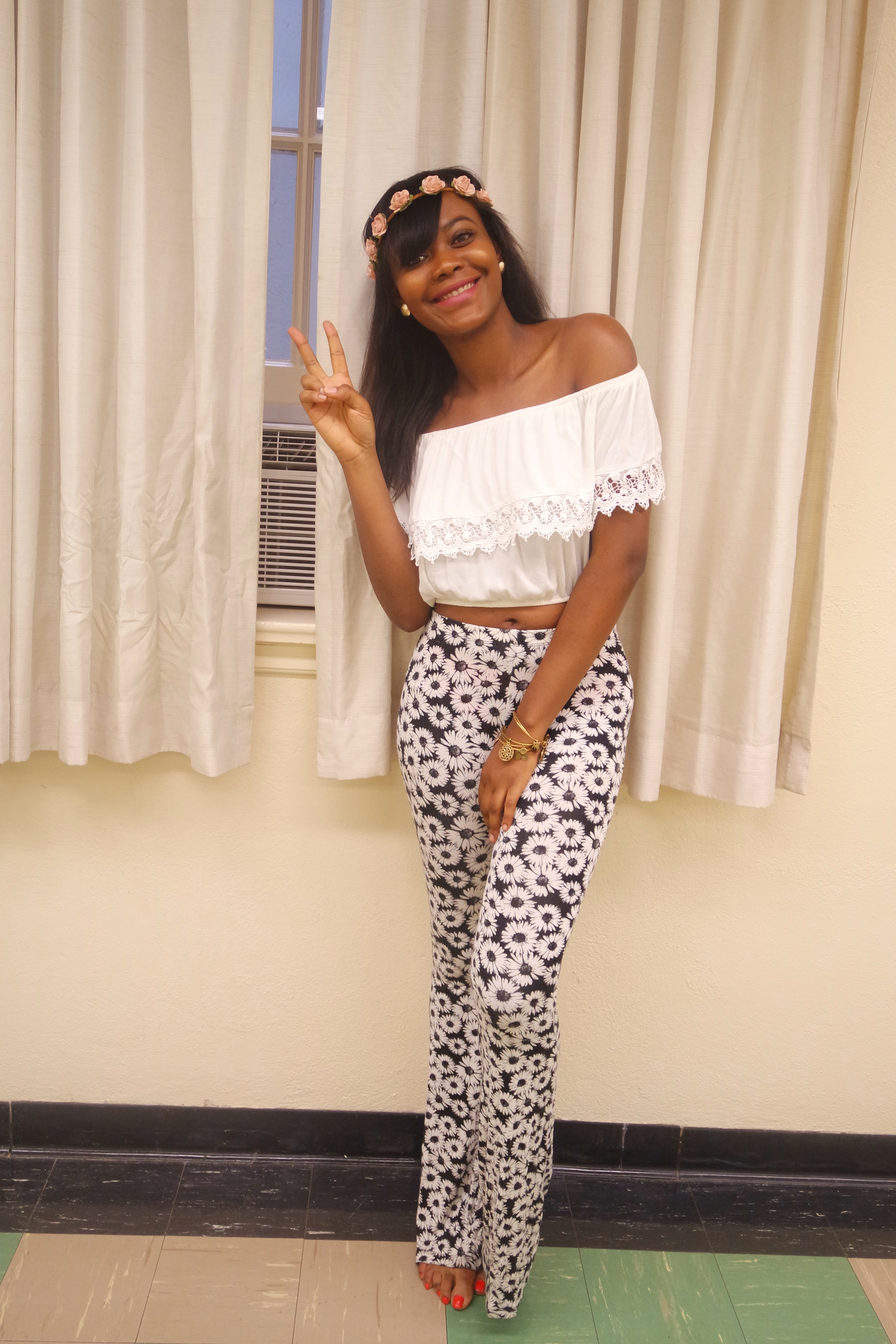 Another basic costume is the Hippie look but bohemian fashion is so in right now that I thought I’ll play around like a trendy Hippie look. Flare print pants, off the shoulder tops, and flower headbands were trending this summer so it’s only right. This look is so fun and cute plus its really comfortable to walk around in. Surprisingly, this look was every bodies favorite out of the entire collection.