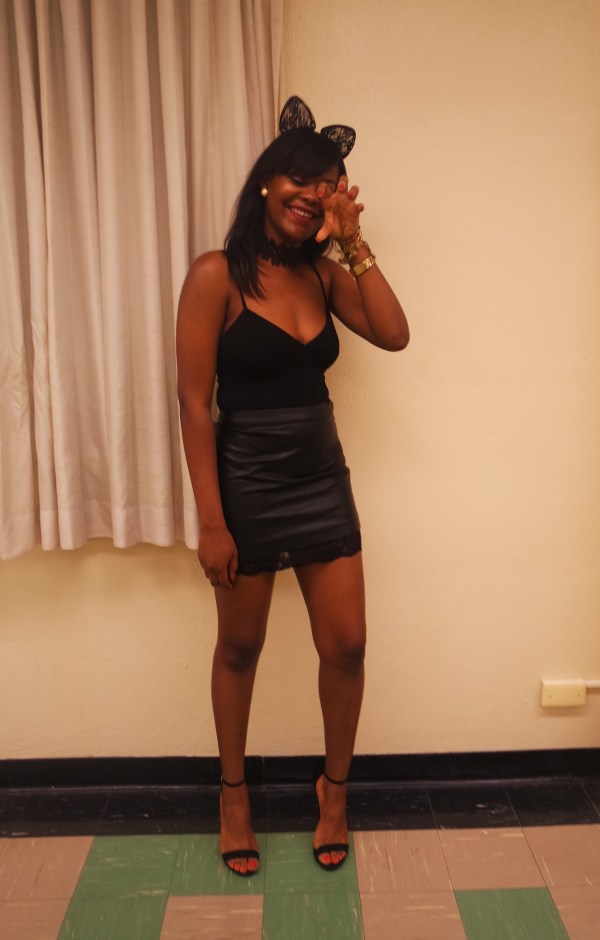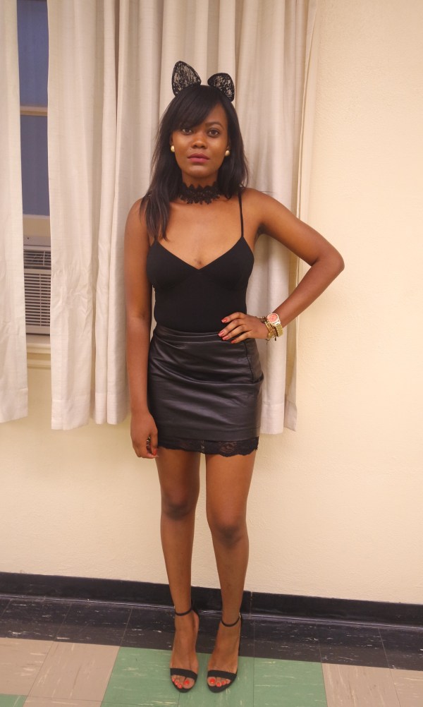 Of course I saved the best for last, I must say my favorite look in this collection is by far this one. If you look in my closet, black isn’t something you’ll find. I find beauty in color but this look made me reconsider things. Not only did I try an all black look but I also played with leather and lace when I dressed up as cat woman for a final look. All black is usually too dark for me but with this look I’m ready to be dark. Cat woman is hot, flirty, and totally badass. I love how she’s paired with dark, and cold batman because it takes a certain type of woman to fix a guy like that. My favorite accessories were with this look, I wore a thick lace choker and lace ears from Forever21. In fact every piece of this look is from Forever21 expect my heels, they’re from GoJane.