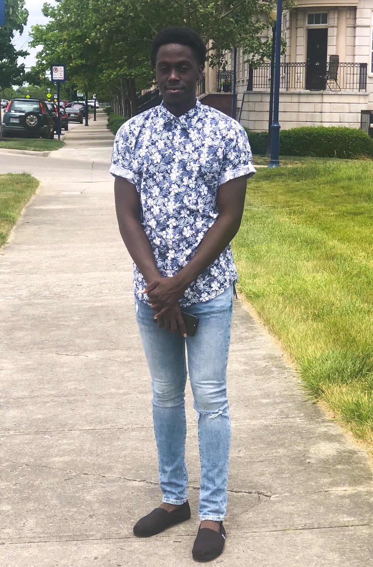 Fully aware of the print, AK paired this statement piece with light wash jeans to compliment its hue. His style is mindful, he neutralized the colors with a complimentary pair of bottoms and black on black Toms. The style tip for floral shirts are to tone your other pieces down, not overdo it, or take away from the print. Arnold’s tip is to compliment it as best you can. And once that’s done, don’t forget to roll up the sleeves. This speaks volumes on his personality, the man in the floral print comes out nicely whilst he brings together complimentary elements.