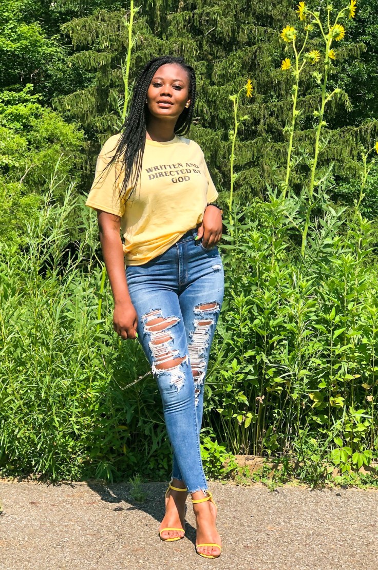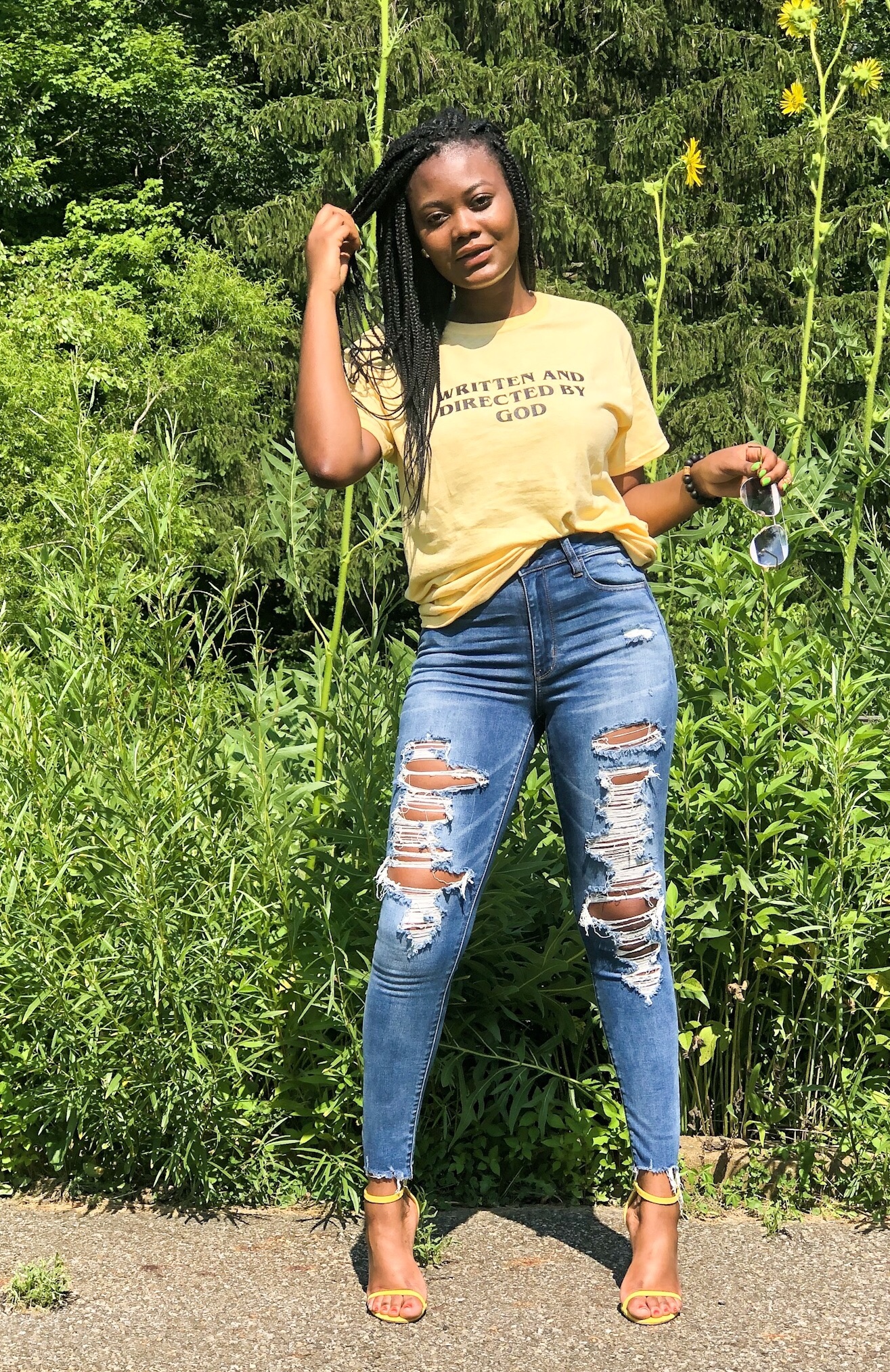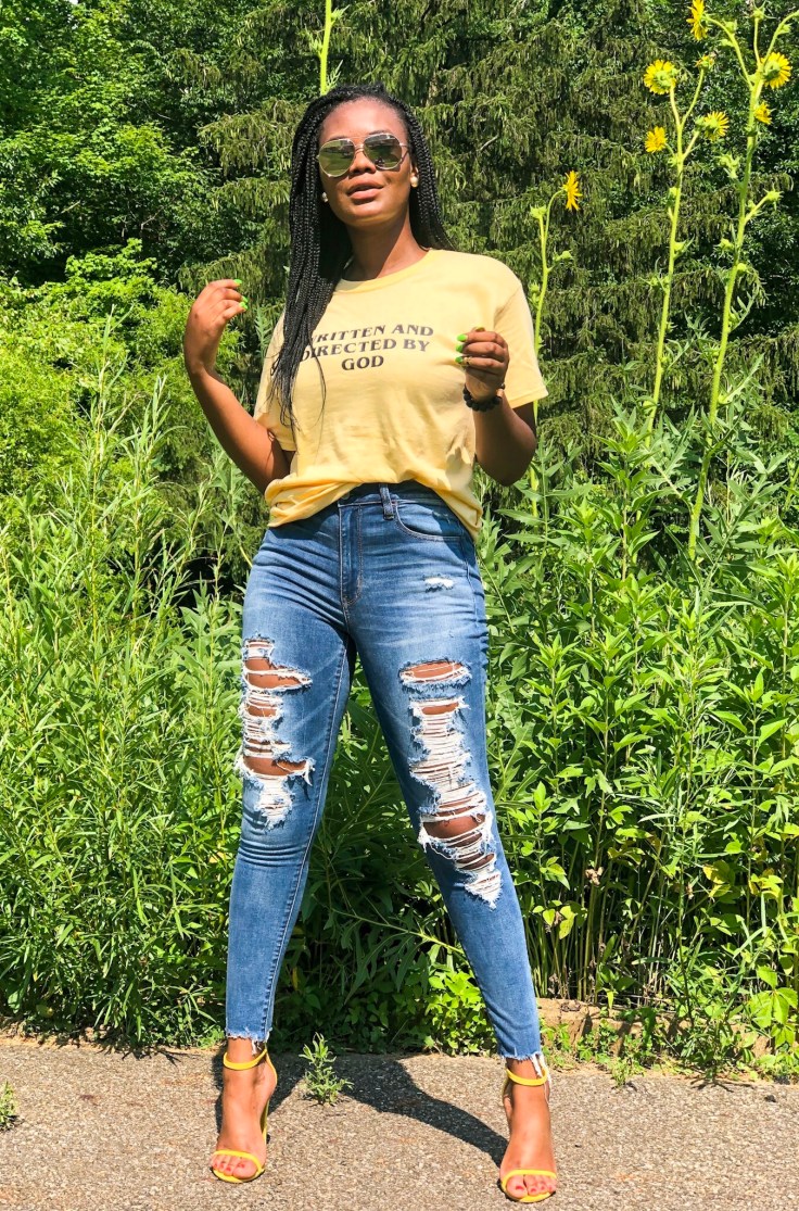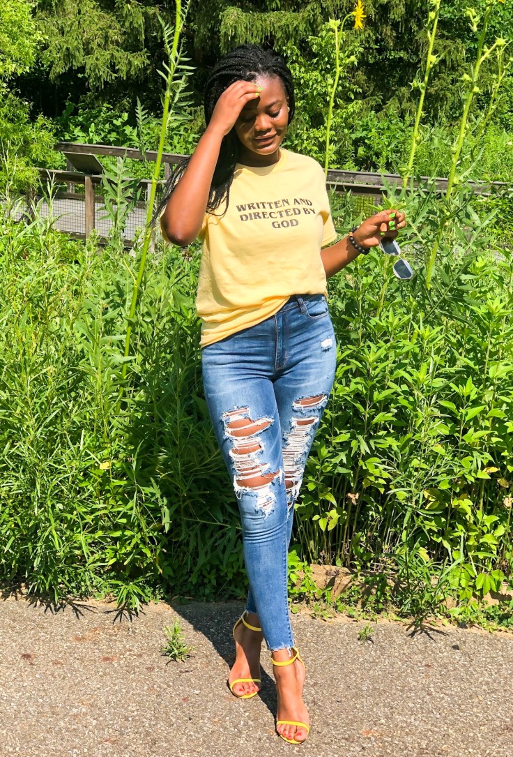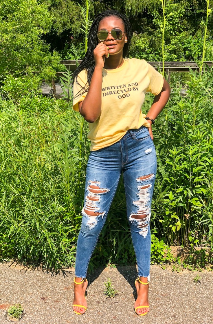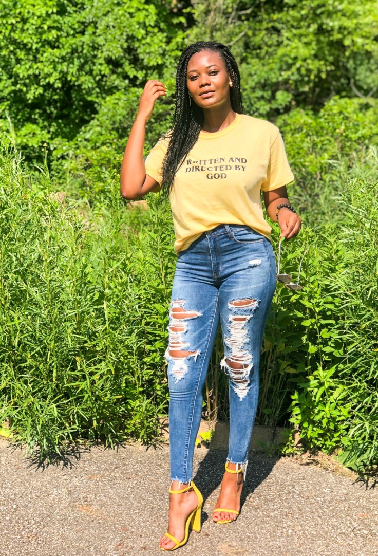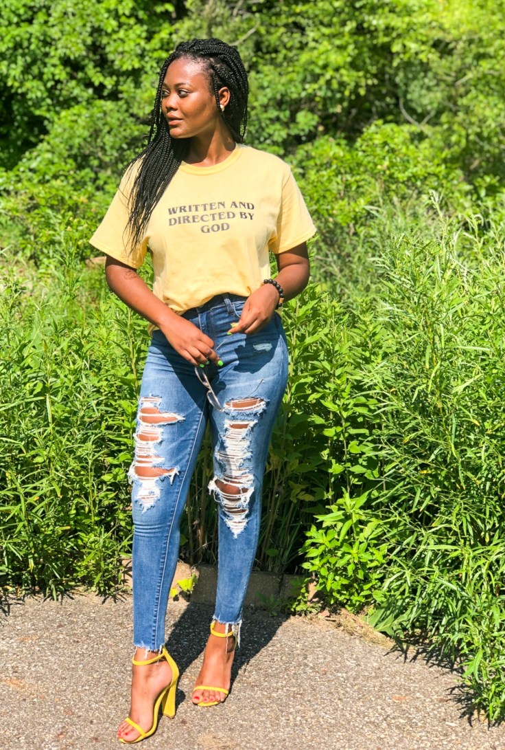 This post consist of a look for this “God Is Dope” T-shirt. God orders my steps in life and the saying on this shirt is a true testament that I am not the only one. Loose and a bit too long, this blogger found a balance once paired with distressed jeans. To finish off the look, I added a yellow pair of heels to heighten the color of the shirt. My looks are my creative expression, which is a form of therapy. Fashion is my art form while faith is vital for my life satisfaction. If Christian churches were more open to creative expression, believers who choose to partake would not be scrutinized. Freedom of expression doesn’t agree with modesty but it can exist in Christianity.