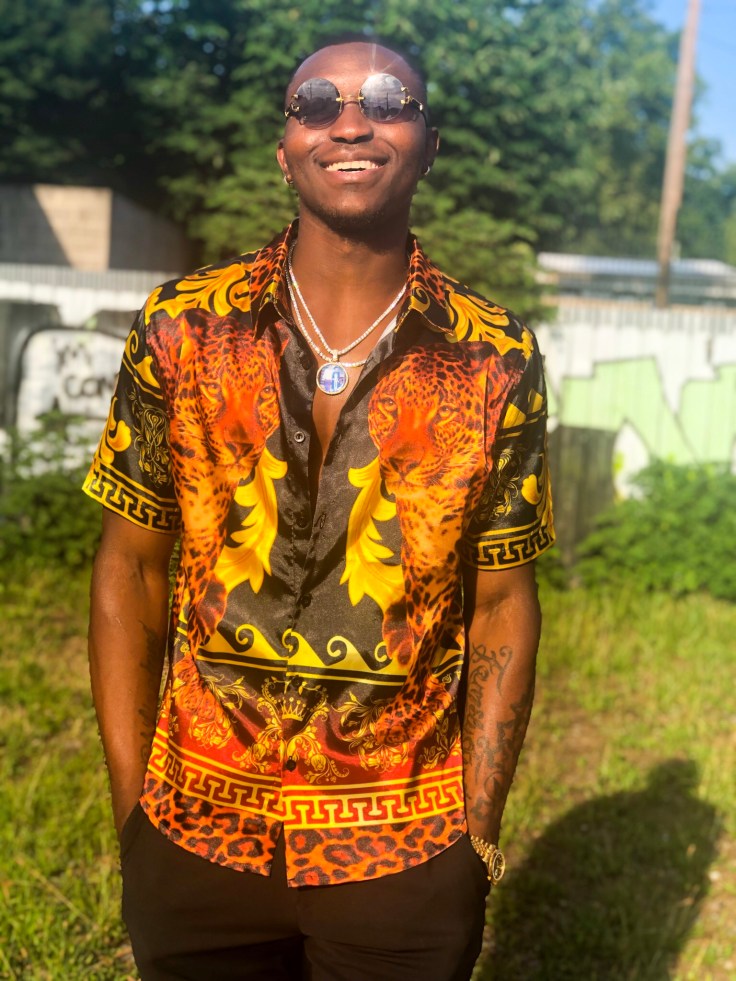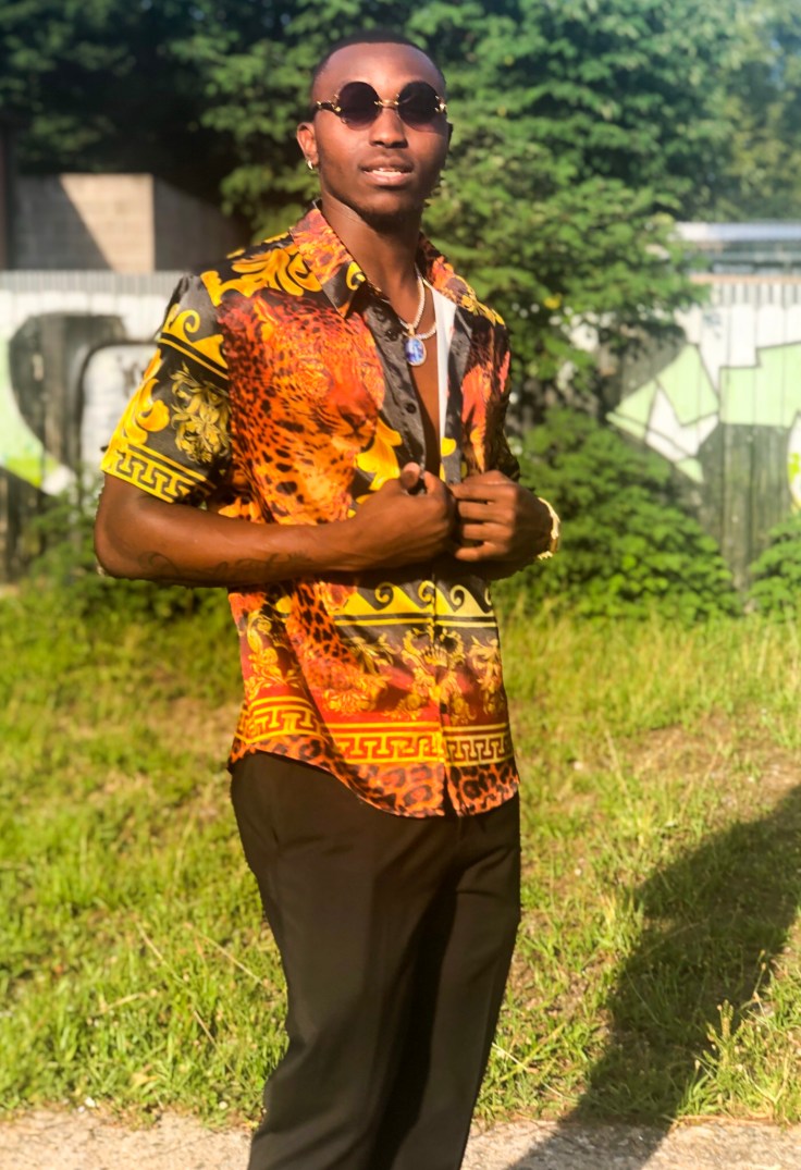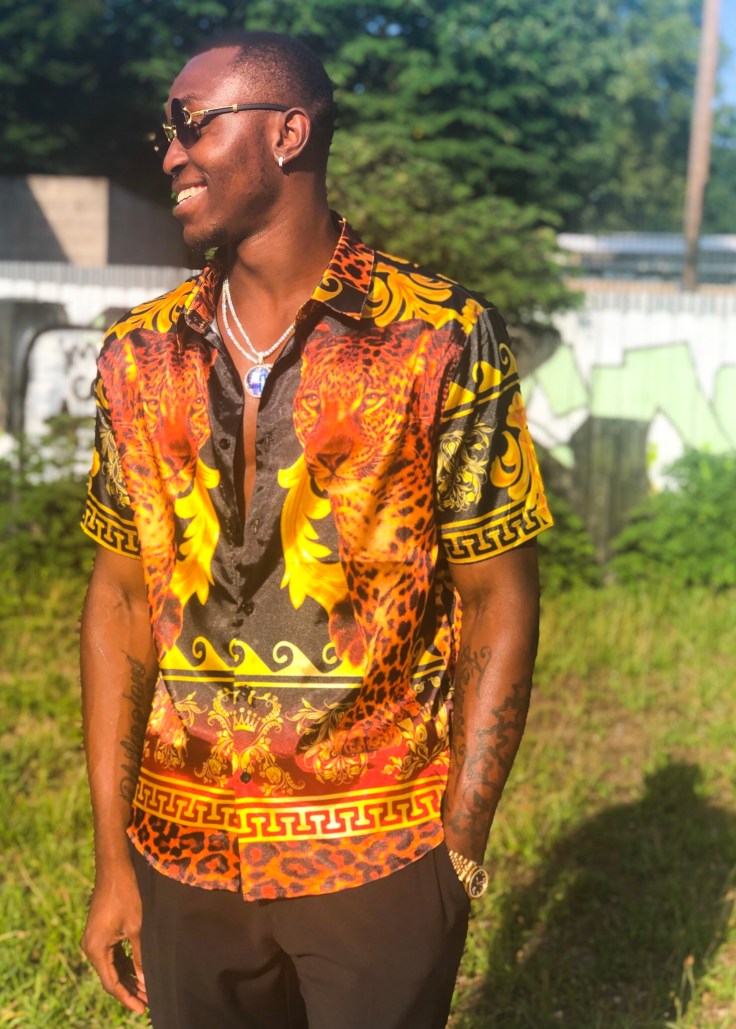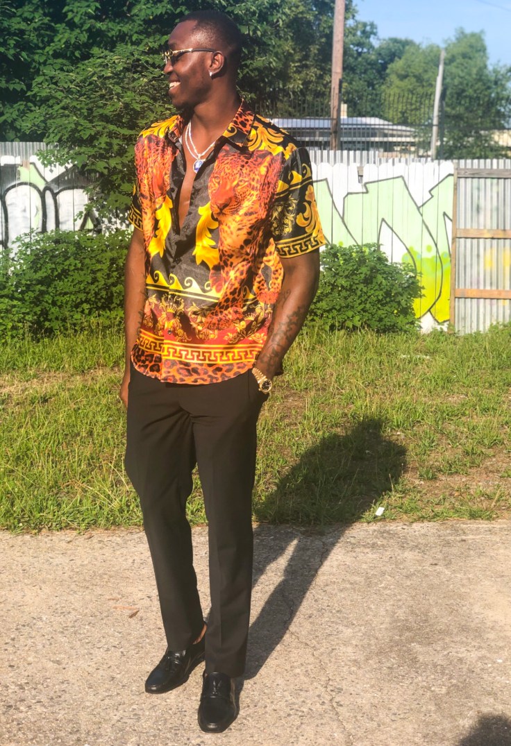 The short sleeve woven top is the main attraction. Hot boy summer, Ben couldn’t resist the urge of unbuttoning his shirt. This top was purchased from Jimmy Jazz’s exclusive collection and designed to feel silky smooth on ones skin. Light weight and breathable, he paired this top with black dress pants and shoes. The perfect outfit isn’t complete without accessories; a Rolex and chains were the final touches. Let’s not judge a man by his collar, this model is a breath of fresh air. As the temperatures rise, let’s opt for bright styles that keep us aesthetically cool.