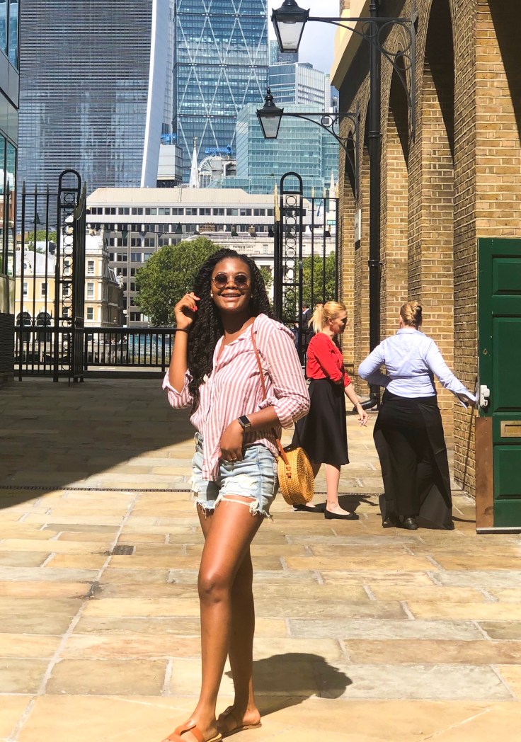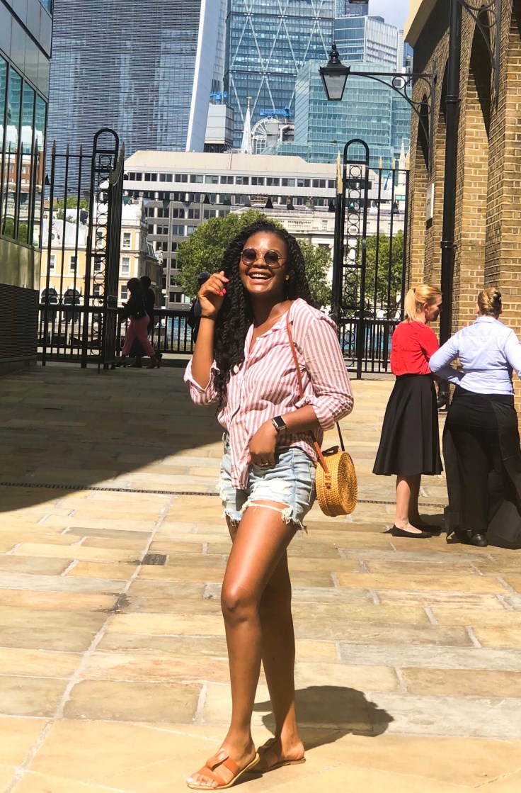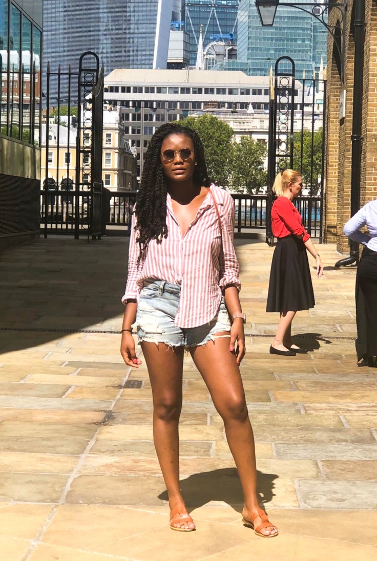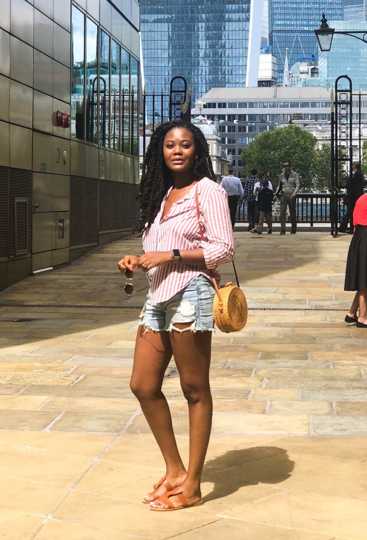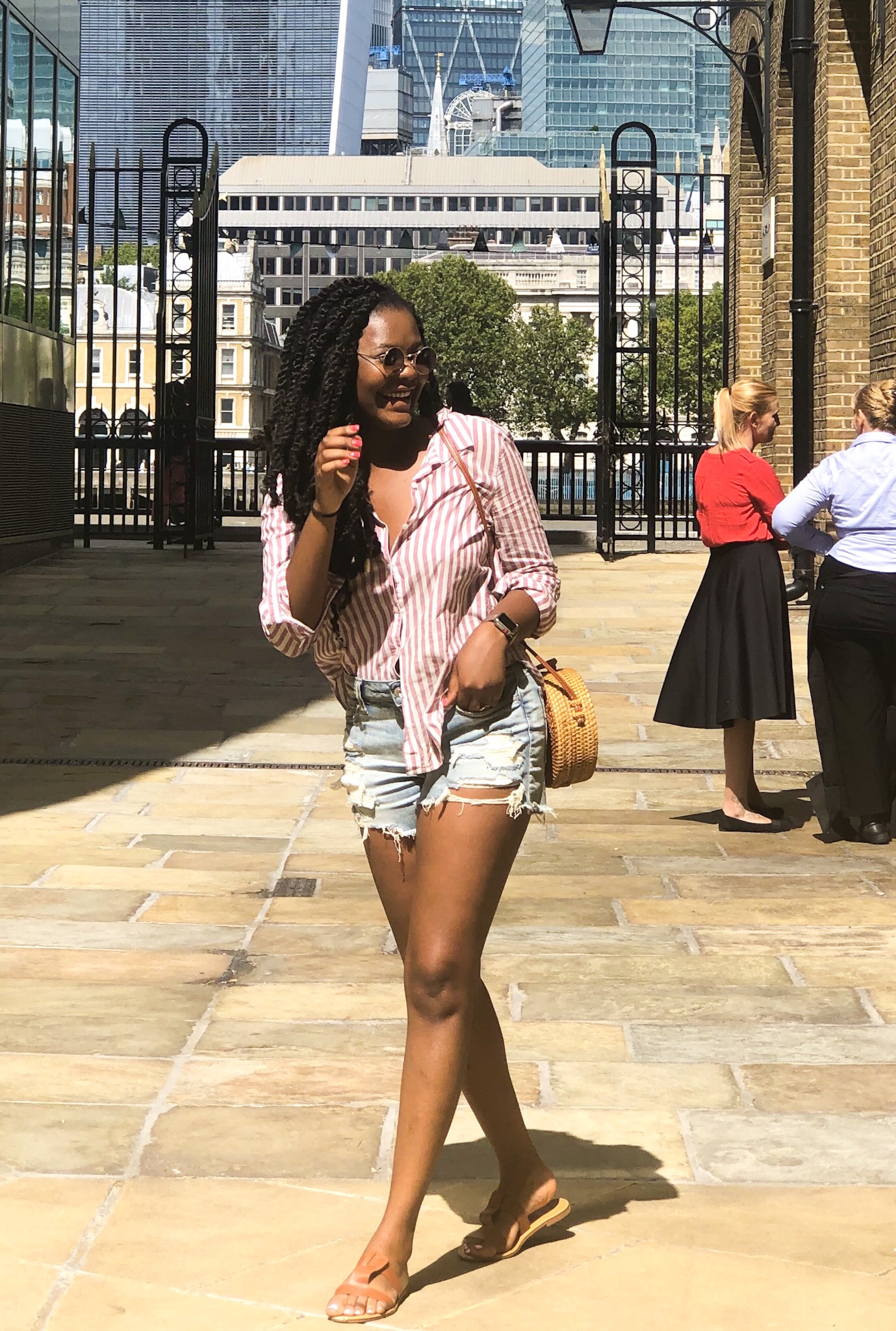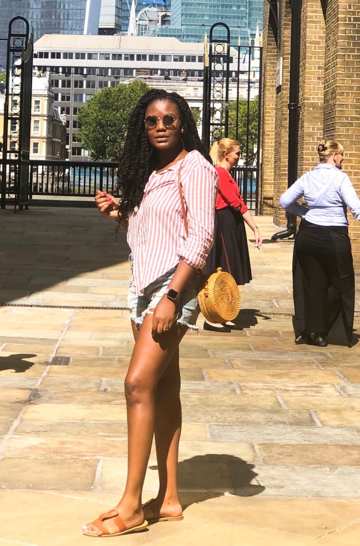 An international outlook, UK fashion is a power vector for well put together personal style. The sun actually came out in London for me to showcase my personalize style. My uniform on my shirt day in London consisted of a striped shirt and boyfriend shorts. To add a vacation vibe to the look, I paired it with sandals and wooden round purse. This look was completed with a small pair of round glasses purchased in Paris. A vacation has been long overdo for my lifestyle and this London look embarked me on a journey of peace and fashion.