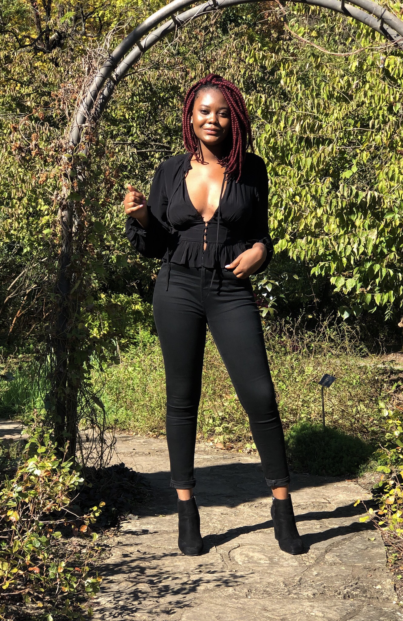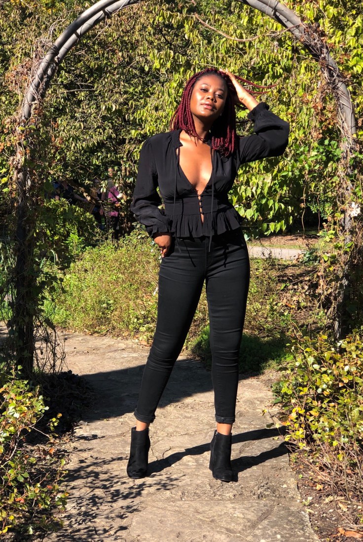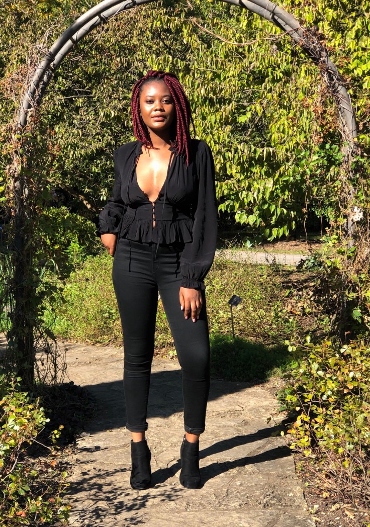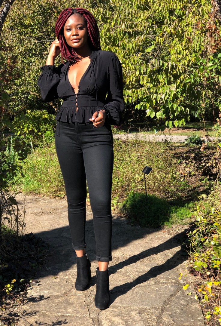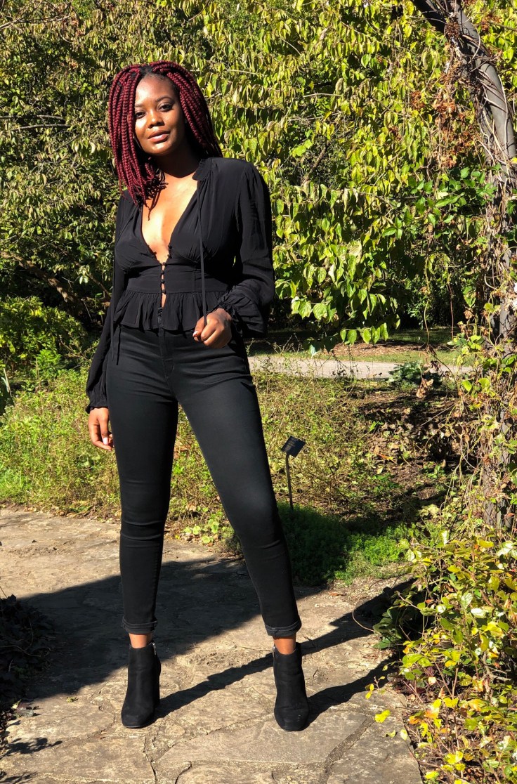 As I dabble in darkness, I’ve found that all-black-everything looks are the classic twist I need for this gloomy weather. This post features a button-front top, combined with black jeans and chunky-heeled booties. This look was put together last minute for a club opening. This goes to show that when chosen, all black works for any event, a club opening, dinner, or even work. The versatile shade of black will forever stay the new black with ease. There’s assurance of power and confidence in the shade, and in its glory it always feels timely.