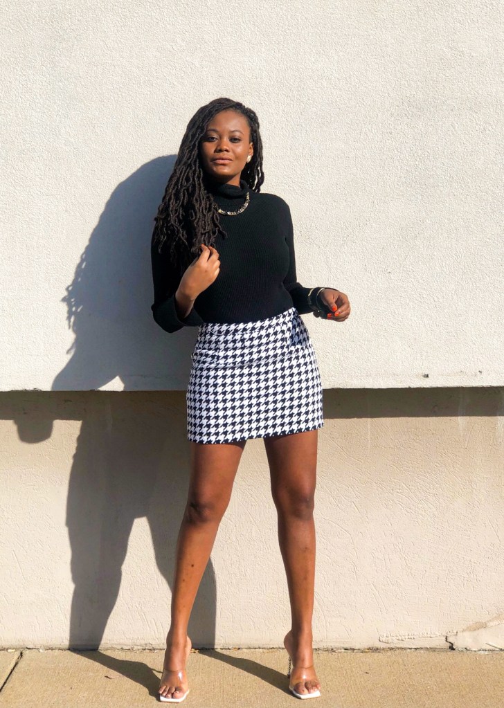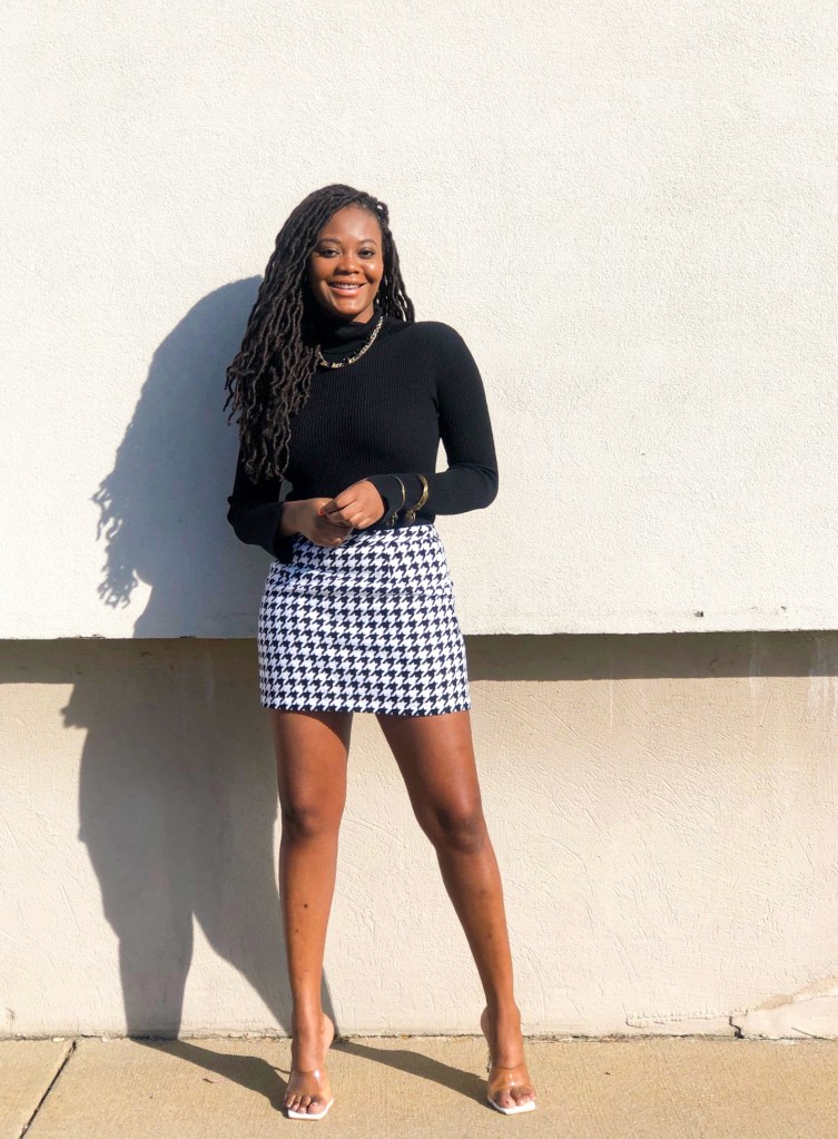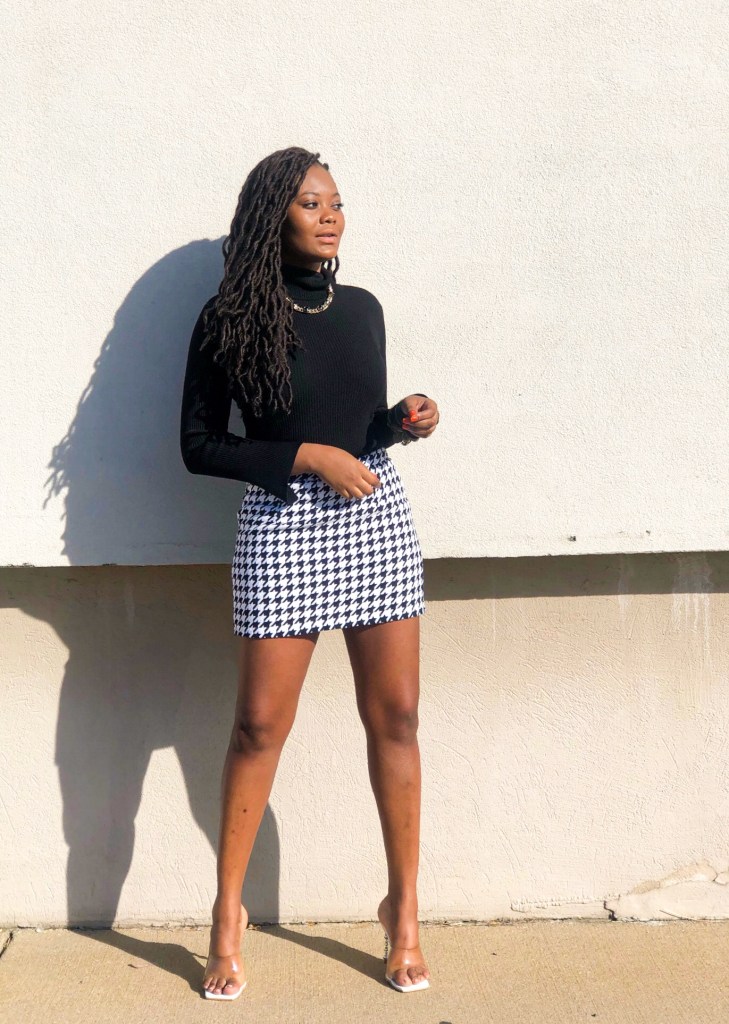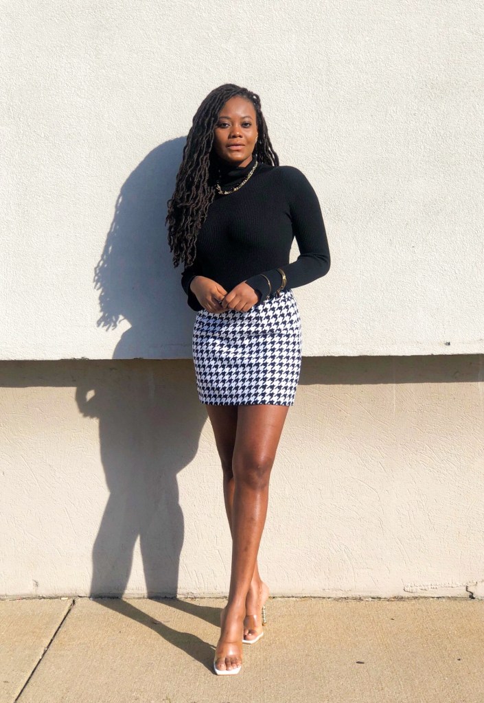 Whitley Gilbert normalized black women living in luxury. Her impact went beyond her wealth and beauty, her style was unmatched. Her unending looks inspired a lot of black women, including myself. She pioneered the archetype prim and proper; that all a black woman needs is a two piece suit and pride in their blackness. Whitley taught me to appreciate the classic pattern we call houndstooth. That pearls and gold jewelry both have a place in sophisticated style. This look is dedicated to an influencer who was ahead of her time, the original Bad & Boujee, Miss Whitley Gilbert. A turtle neck styled with a mini tweed skirt will always be the Whitley special.