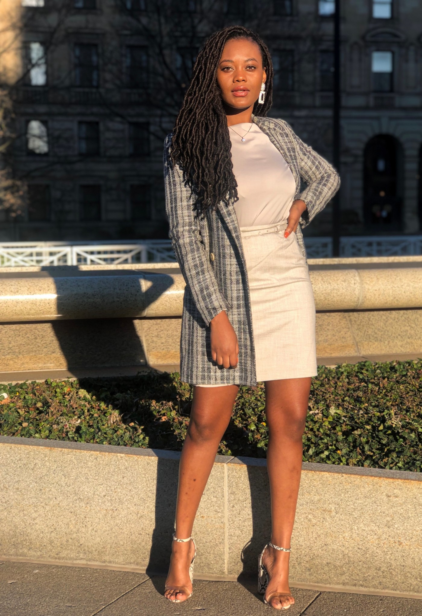 After nine months in quarantine, I am still trying to get more wear out of my summer clothing. This look features a gray long sleeves top and skirt set from H&M. A Zara trench coat was added as a winter bonus. To build a bit more on this simple look, I added statement earrings and snake print sandals. The beauty of fashion is that there are no set rules. If you are stubborn like I am, you will figure out ways to incorporate any attire on your fashion heart into a piece that can endure even the harshest weather. The skirt on this look serves as an ode to the summer while the long coat is a welcome gift to winter weather.