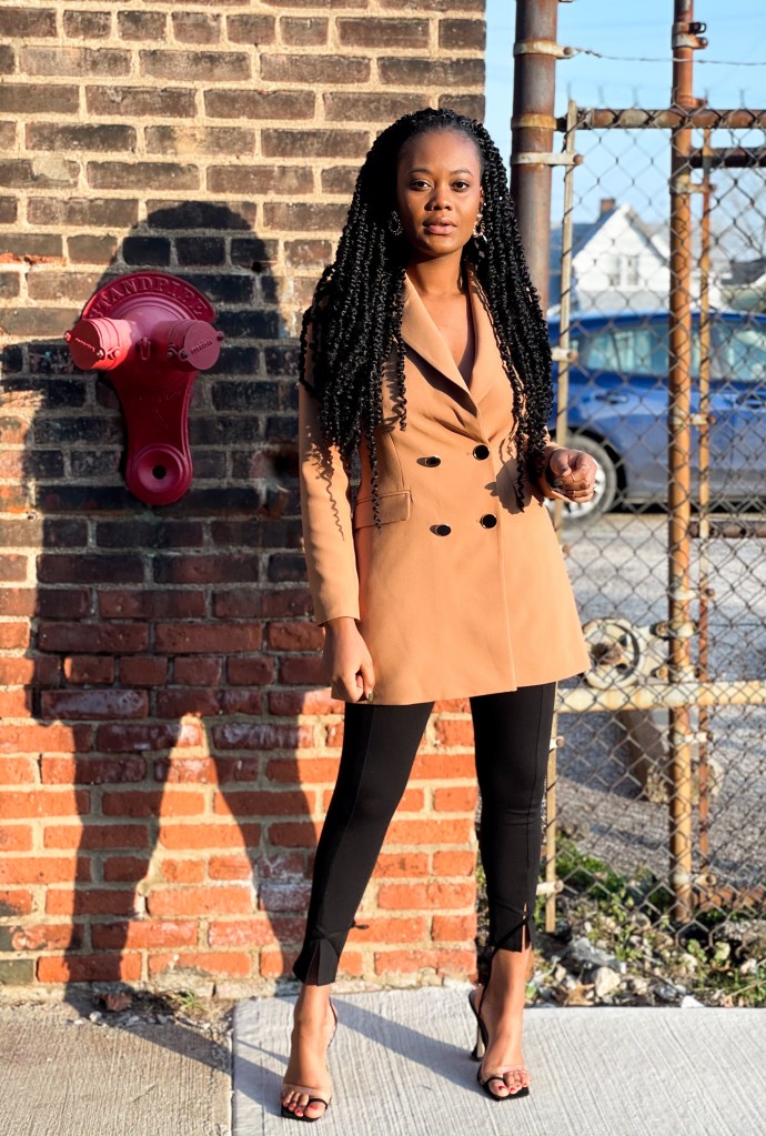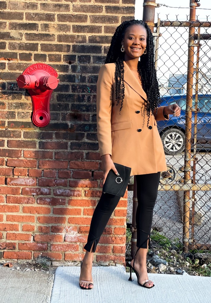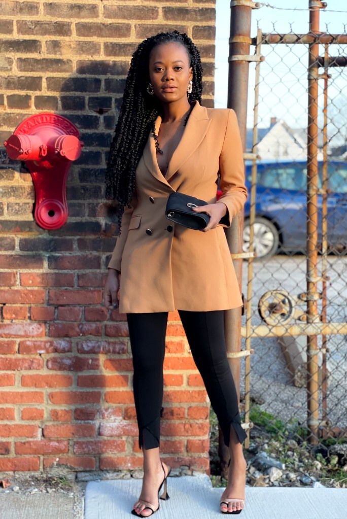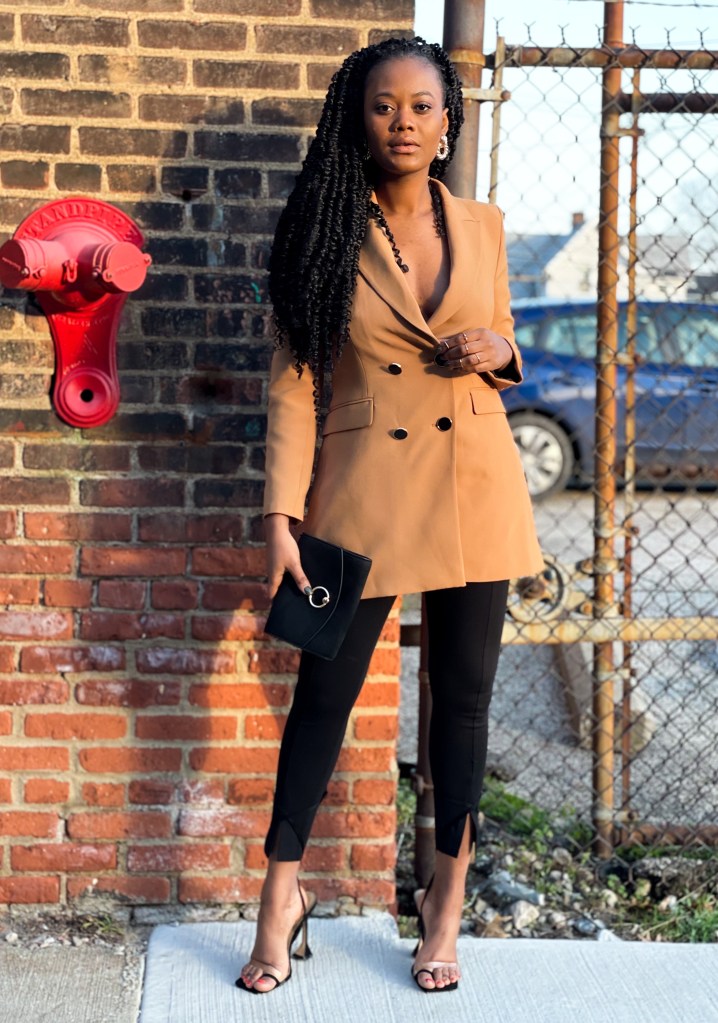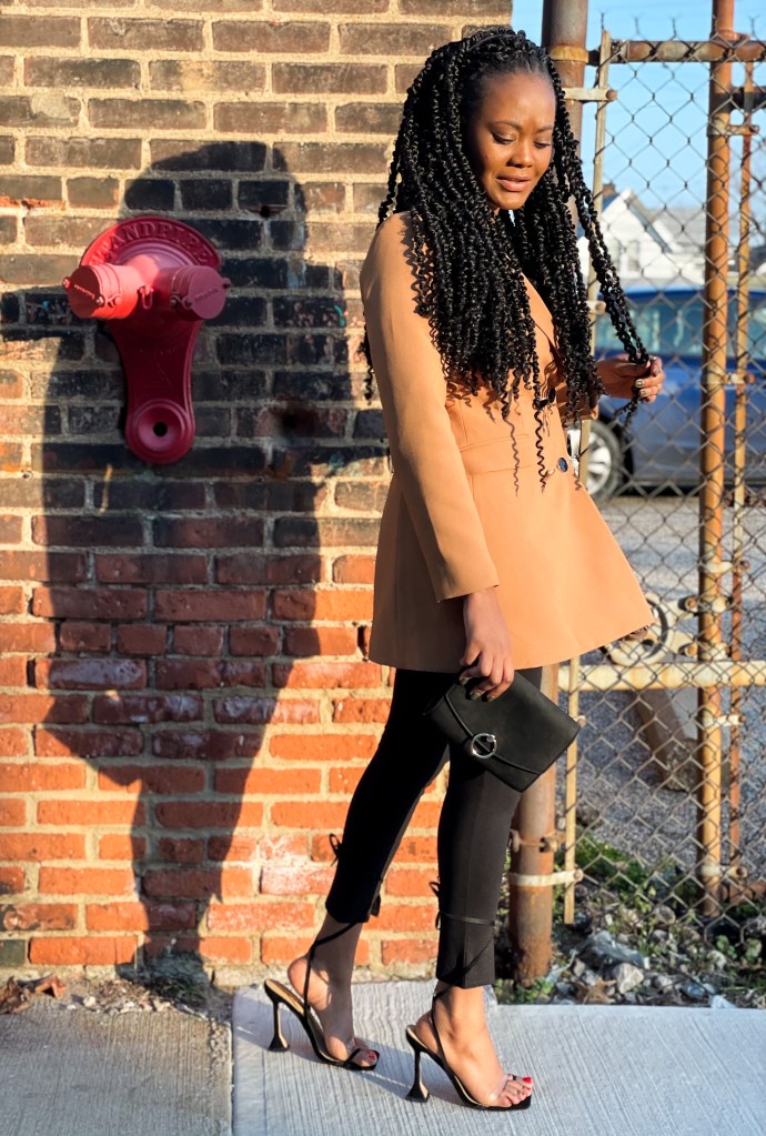 For a chic wintertime look, I styled this gorgeous camel double breasted blazer with front slit black pants and lace up heels. I prefer to wear my blazers alone, rather than layer it over a silk shirt. This outfit can take me through a full day. I can run out of the office and head to a happy hour or a dinner date in this look. The beauty of a blazer are the never ending possibilities of looks. In its time, it will serve as a coat on a chilly summer night over a dress, the final piece on a pair of navy blue jeans for a dressy casual day at work, or the completion to a two piece suit.