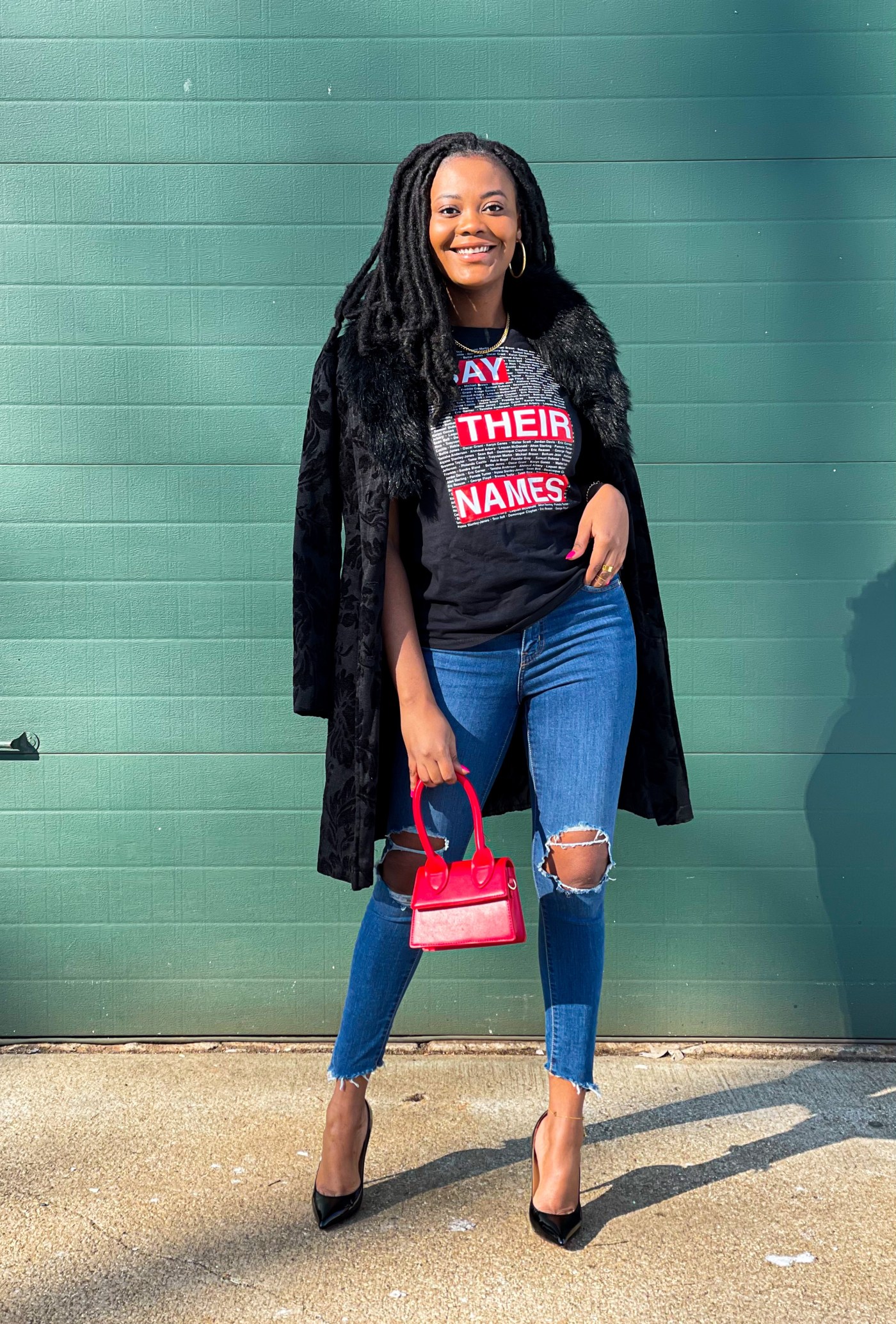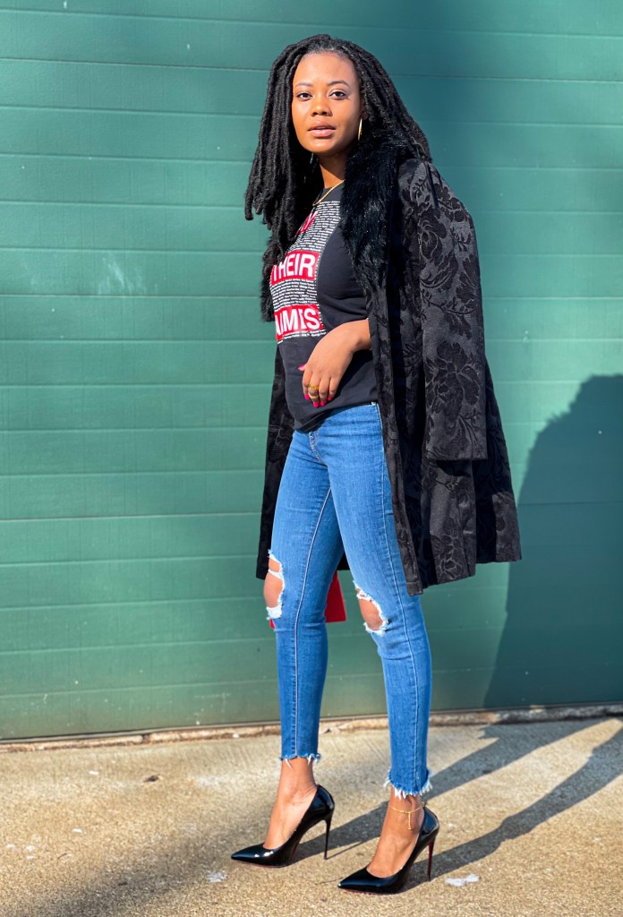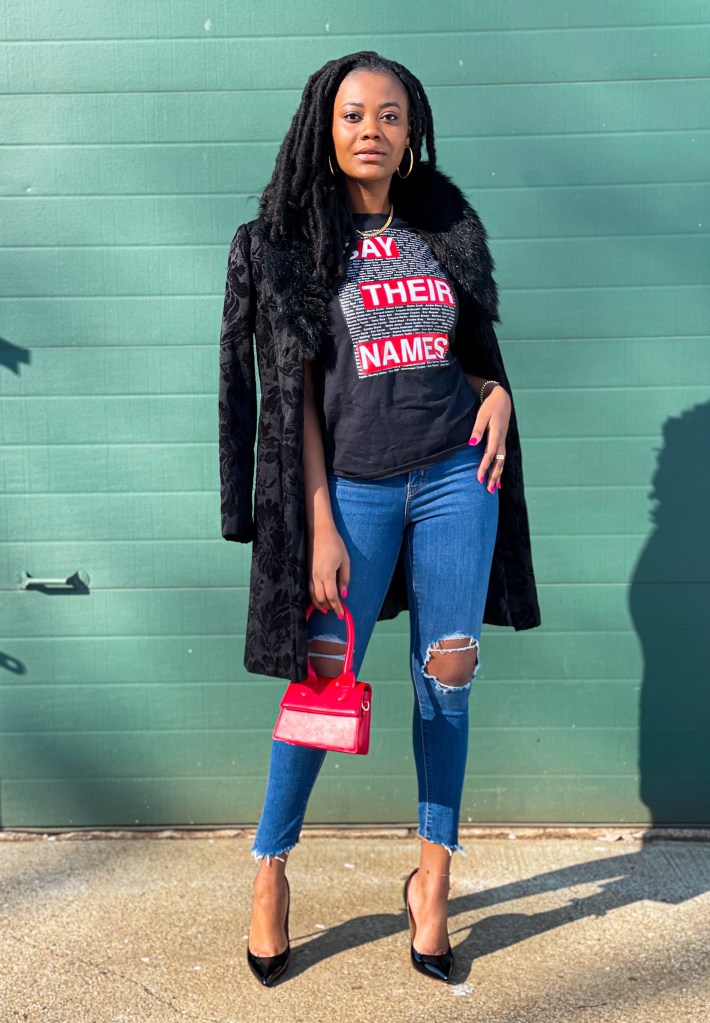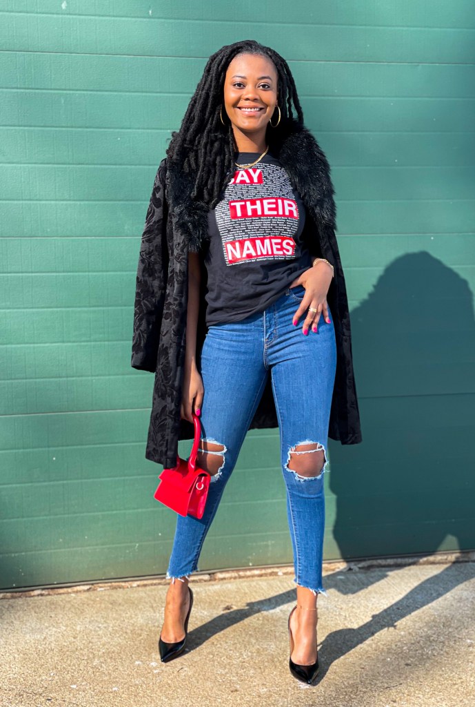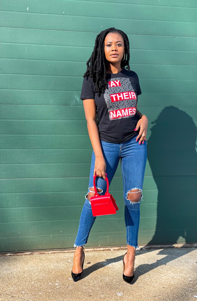 After years of losing innocent Black lives, 2020 was dedicated to acknowledging those lives and pleading for a change. 2021 should be dedicated to our voices being heard in every field we are in. Regardless of your pathway, if you are Black, your voice matters. In my professional life, I used this month to start a Black Hair Products Drive for African refugees. In fashion, I want to use this moment to highlight all the lives lost. The names on my shirt do not cover even a fraction of the lives lost but it’s a start. I styled this look with a Black Lives Matter heart, my raised fist, and Blood lost Red Bottoms. How are you styling your life after Black History Month?