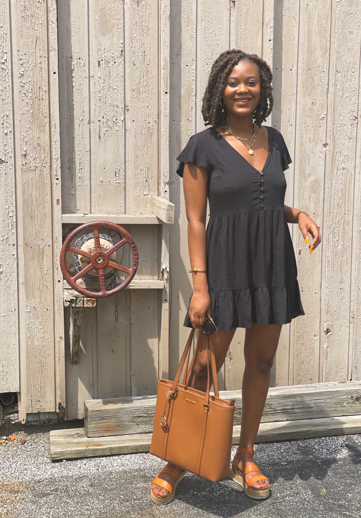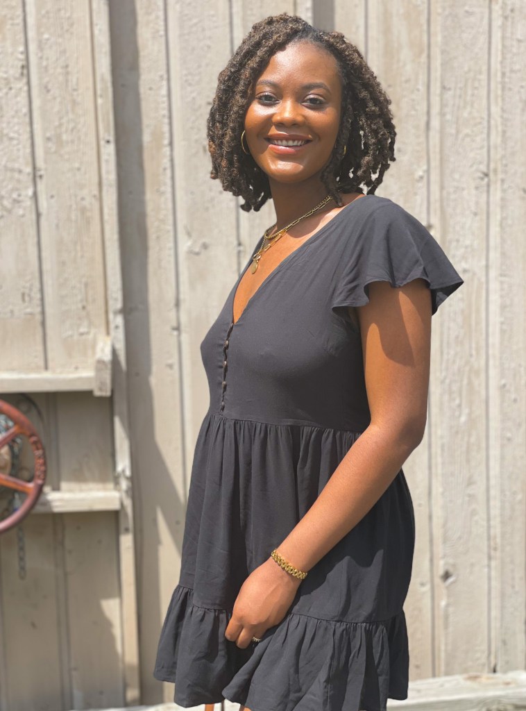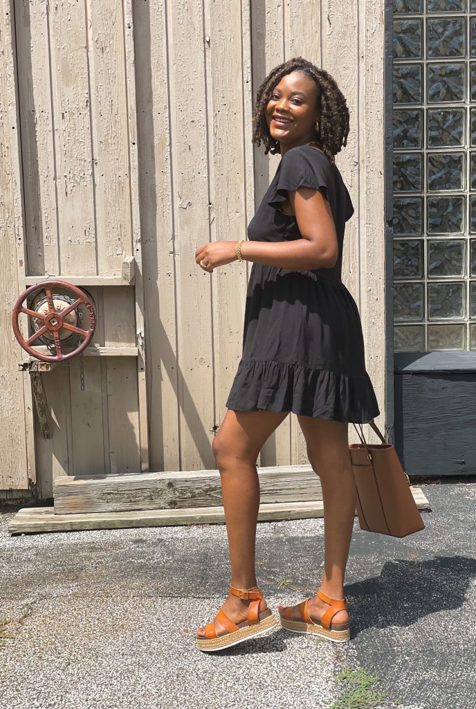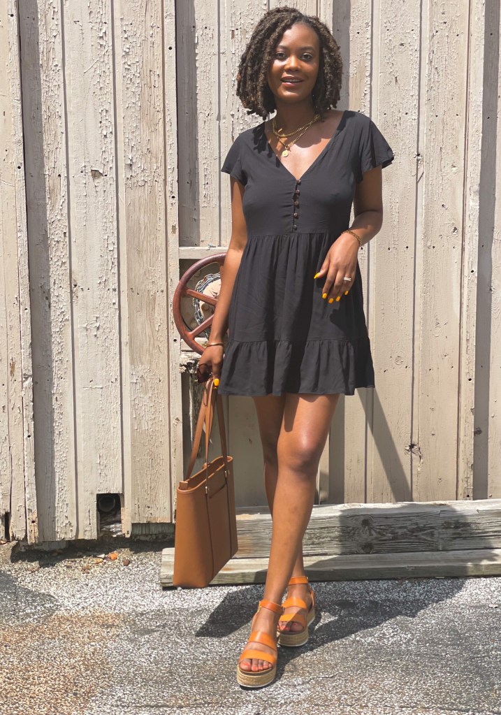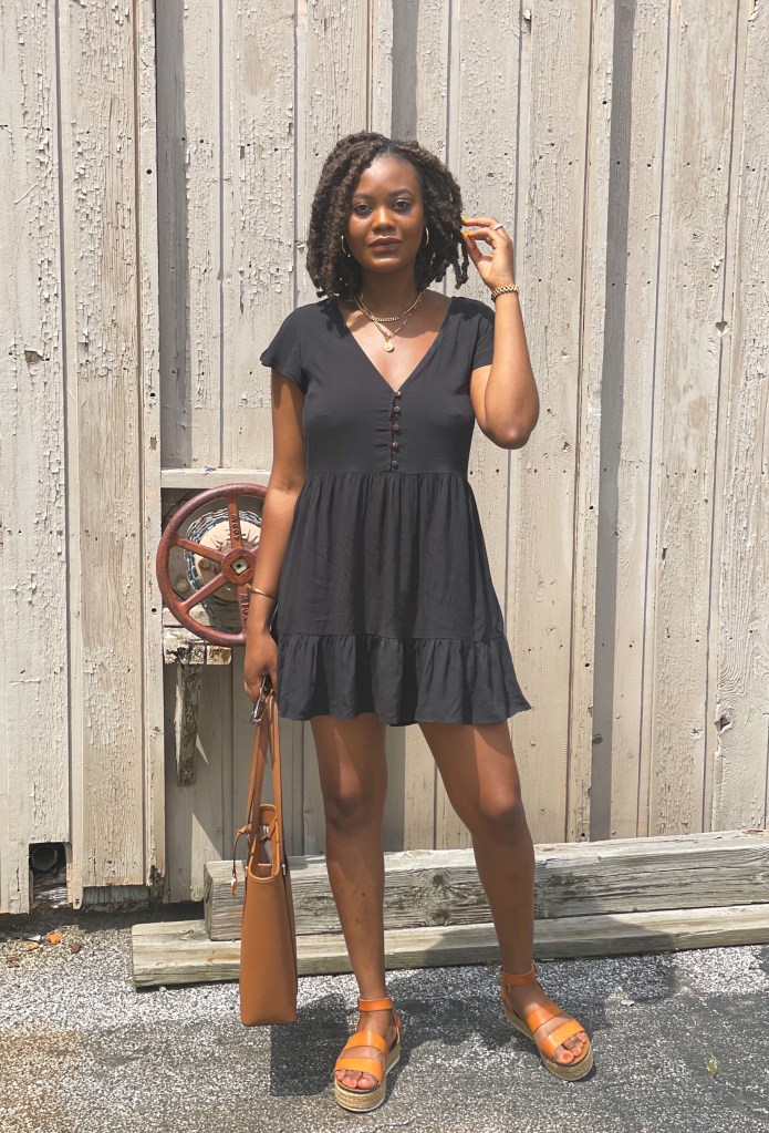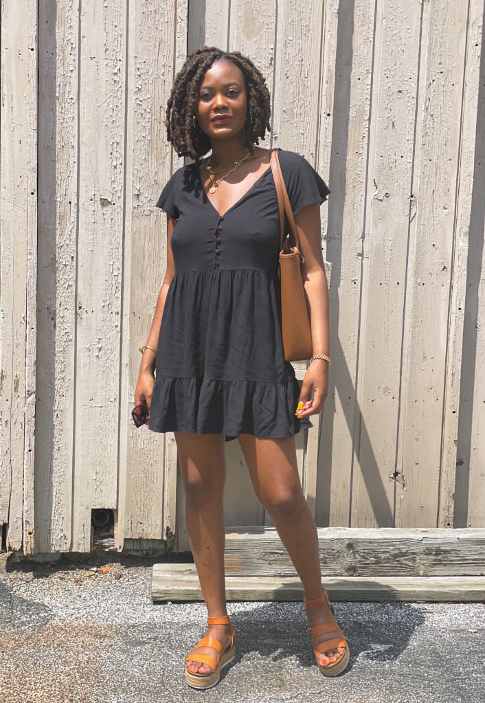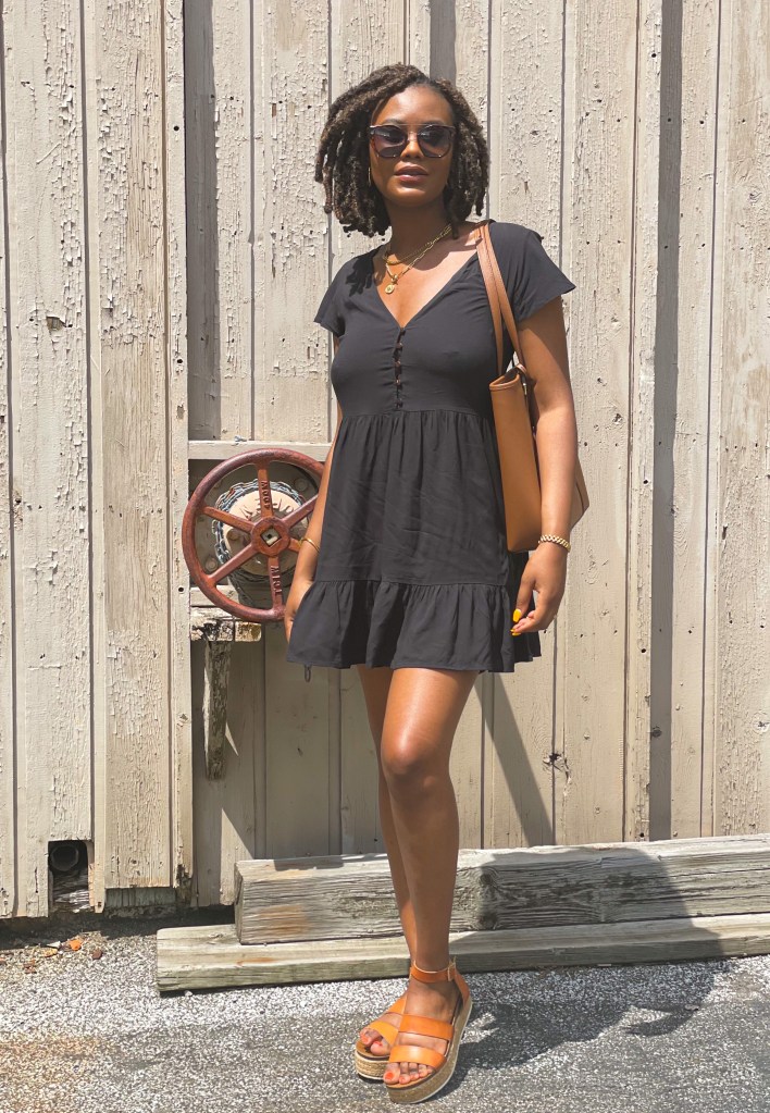 Here’s a dress to flatter all the fun you create. My favorite thing to wear for you is flowy to let your breeze take me away, dark to let in your light, and short to let you work your magic on my skin. I find joy in my style every time I step out in a dress like that. It’s simple yet versatile, perfect for embracing all that you have planned for me. As my time with you comes to an end, I hope you’ll return to me soon, well and faithful.