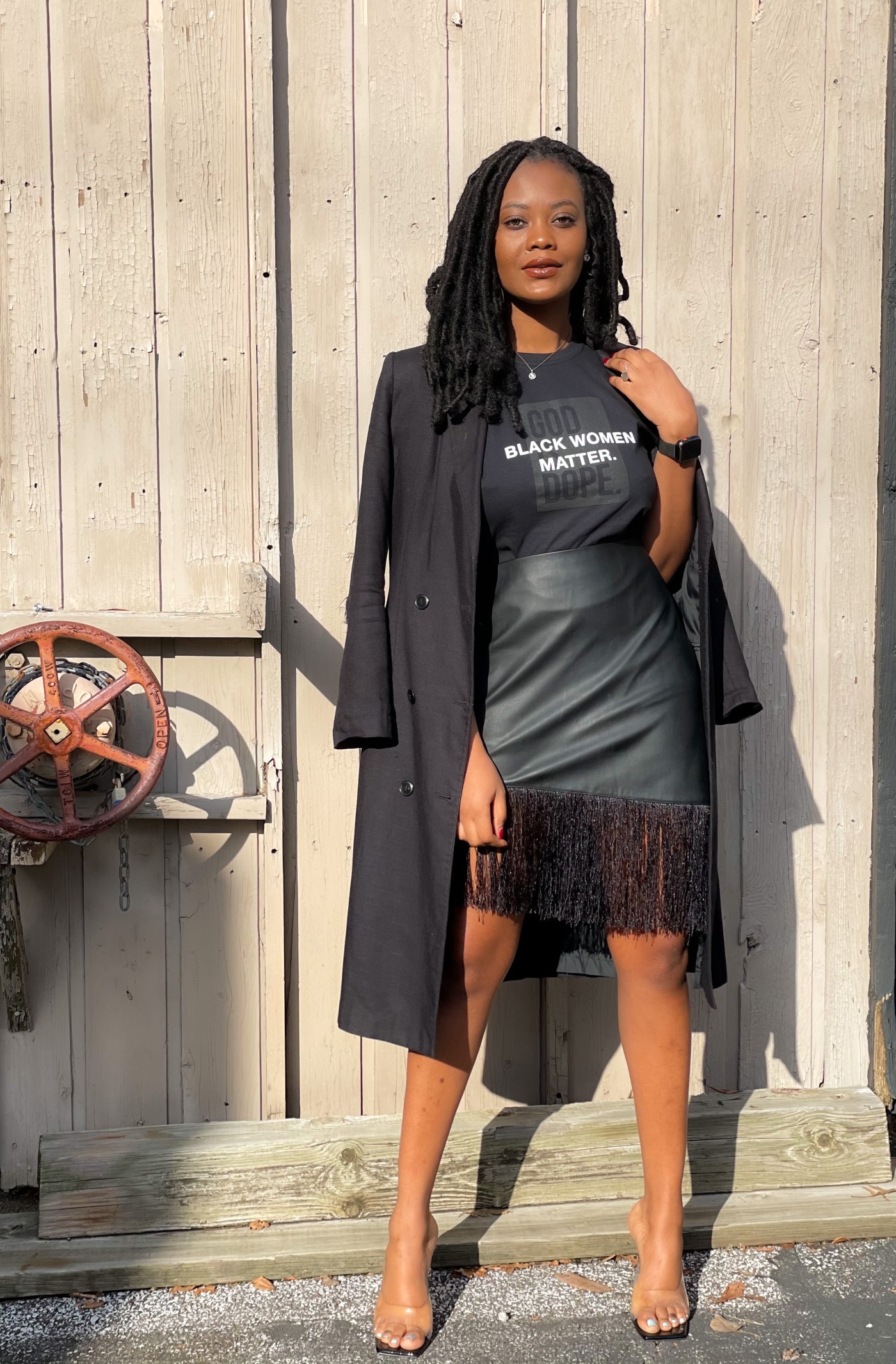 “Black Women Matter” T-shirt Similar | Leather Skirt Similar | Heels Available Here