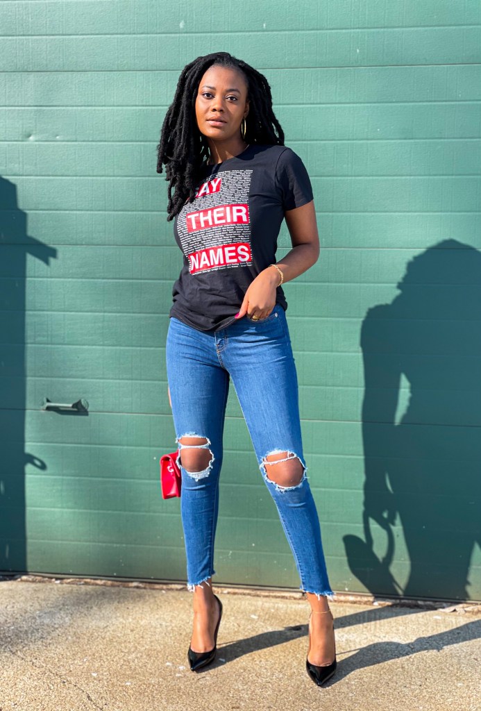 “Say Their Names” T-Shirt Available Here Similar | Jeans Levi’s Similar | Heels Available Here
