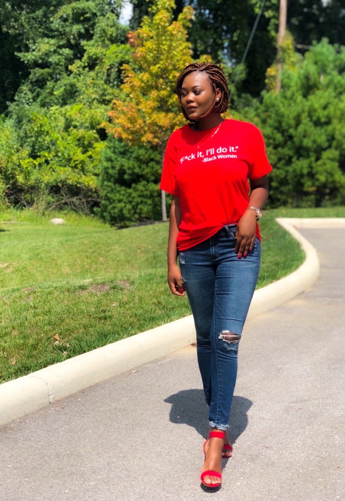 “F*ck it, I’ll do it.” T-shirt Brand Similar | Jeans Similar | Heels Similar