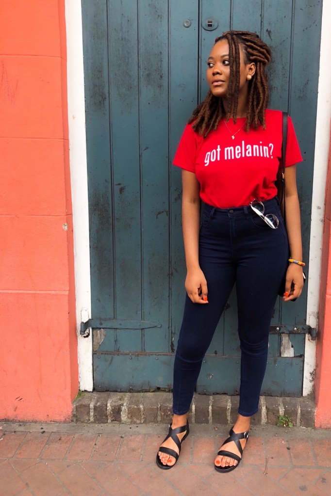 “Got Melanin?” T-shirt Similar | Jeans Similar | Sandals Similar